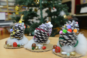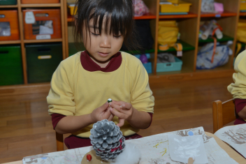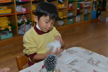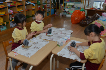 年長さんは、巨大松ぼっくりを使って、クリスマスツリーを作りました
