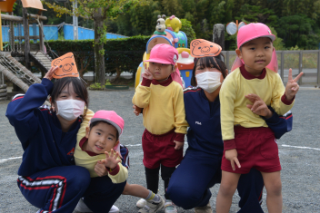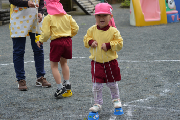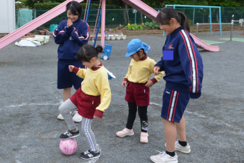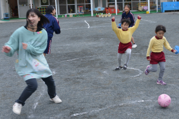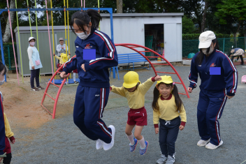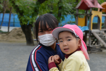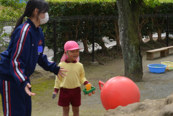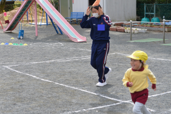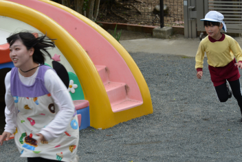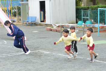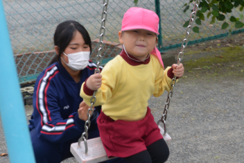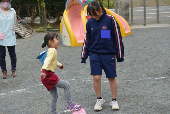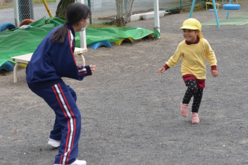外遊びでは、鬼ごっこ、ボール遊び、ままごと遊び、長縄跳び、ブランコ、のぼり棒・・・いろいろな遊びをお姉さんと一緒に遊びました