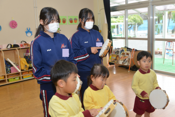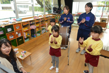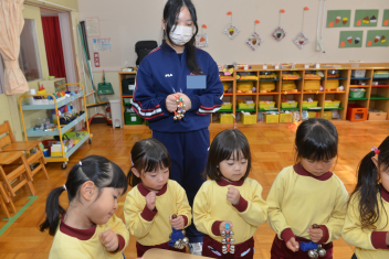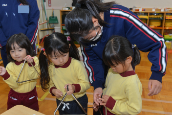 年中さんは、タンブリン、スレイベル、トライアングルの練習をしました