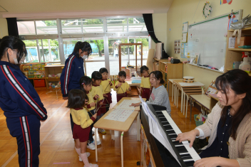 年長さんは、木琴、鉄琴、キーボード、大太鼓の練習をしました