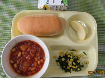 パン 牛乳 ポークビーンズ ほうれんそうソテー りんご