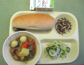 パン 牛乳 洋風おでん フレンチサラダ アーモンド入り煮干しの素揚げ