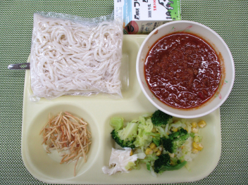 ソフト麺 牛乳 ミートソース ごぼうのカリカリ揚げ ブロッコリーのサラダ