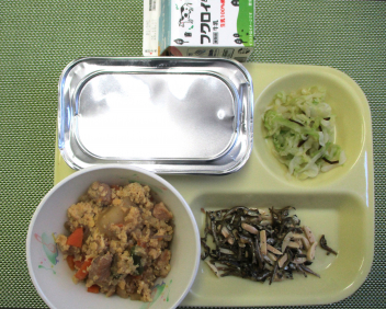 ごはん 牛乳 親子煮 アーモンド入り煮干しの素揚げ キャベツの即席漬け