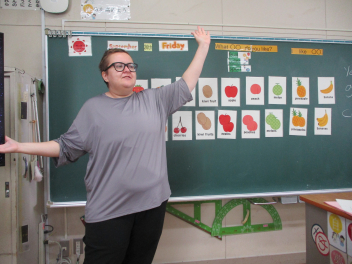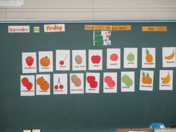 〇〇のところには、今回は、果物、色、スポーツの名前を入れて発音していました。