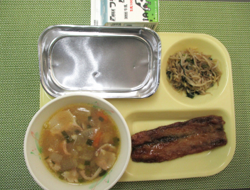 ごはん 牛乳 さんまのかば焼き もやし炒め 豚汁