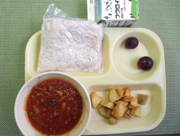 ソフトめん 牛乳 きのこソース さつまいもの素揚げ ぶどう