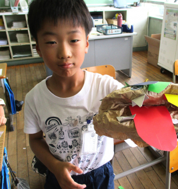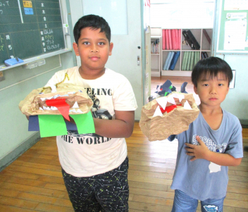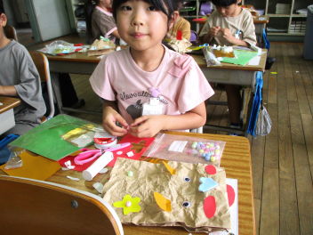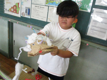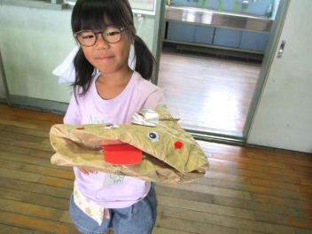 子供たちは、紙袋をくしゃくしゃして、いろいろな姿をつくることを楽しんでいました。リボンや綿など自分の作品に必要だと思うものを持ってきて、作品を作っていました。恐竜、ハムスター、うさぎ、りす、かえるなど、自分が作りたいものを夢中になって作る様子が見られました