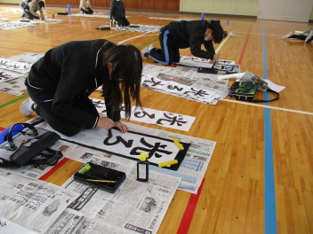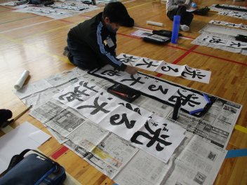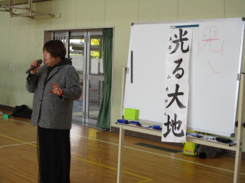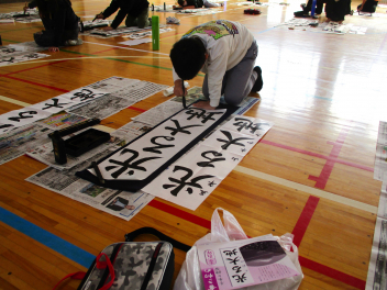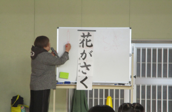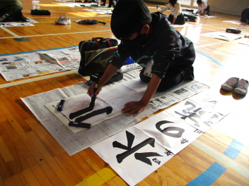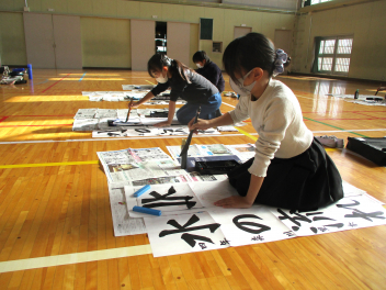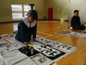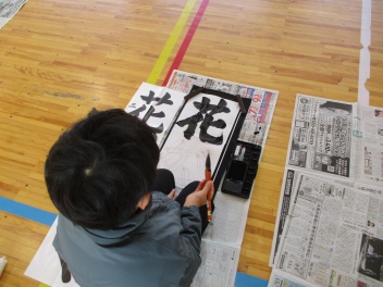 3年生は、「花がさく」、5年生は、「光る大地」という字を書きました。