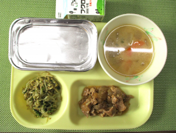 麦入りごはん 牛乳 豚肉のしょうが煮 アーモンドあえ 厚揚げの味噌汁