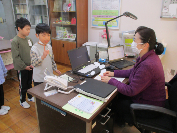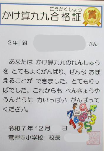 今日は、1組の子供たちが一人一人、校長の前でかけ算九九1のだんから9のだんまでを暗唱しました。すべて言えた子には、合格証を渡しました