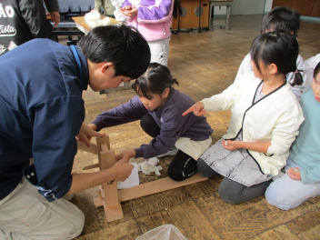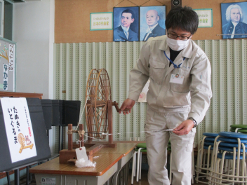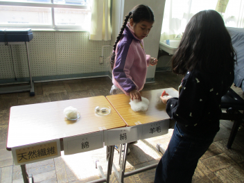 今日は、2年生が、綿が糸になり、布になるまでの過程を教えていただき、1年の国語の授業で登場した、たぬきの糸車などの体験をさせていただきました。