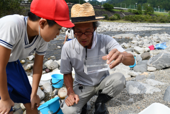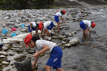 子供たちは川の中に入り、多くの水生生物を捕獲し、その生物の種類を確かめ、水質がどういう状態なのかを知りました。