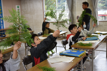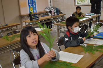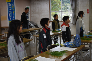 スギやヒノキの枝葉を使って針葉樹と広葉樹の違いを確認したり、木を育てる工程や年月について教えてもらったりしました。