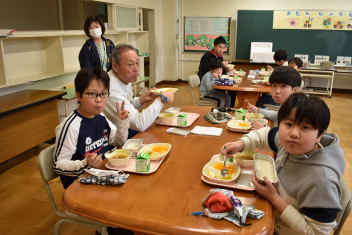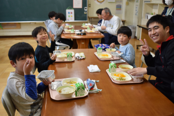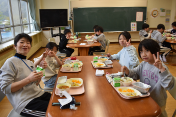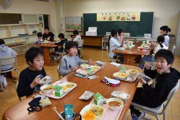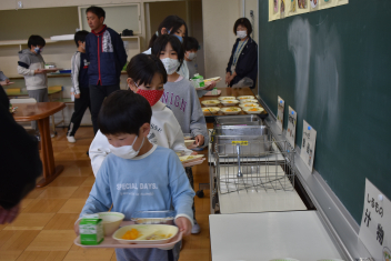 佐久間小は全校でランチルームで食べます。当番も順番にみんなでします。6年生は今年度初の給食をちょうどよく分けて盛るのに真剣でした。1年生も自分の分をひとつずつ取ってテーブルまで慎重に運びます。