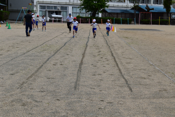• さわやかな天気の下、運動場で1~4年生の体育の学習が行われました。