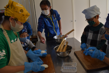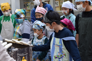 「地域の皆様」や「山いき隊の皆様」に御協力をいただき、上級生が下級生に手をかしたりしながら、一人1本ずつ、五平もちを作りました。