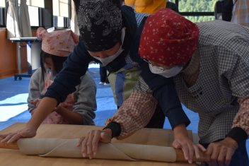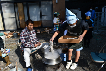 毎年お世話になっている山寿会の皆様から手ほどきを受けながら、そば打ち体験をしましたlaugh