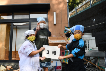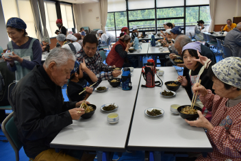 子供たちは、山香地区のお年寄りやボランティアでお手伝いしてくれた保護者とともにおいしく蕎麦を食べましたindecision