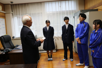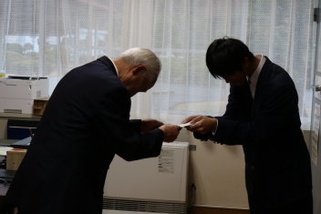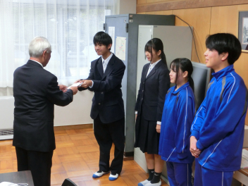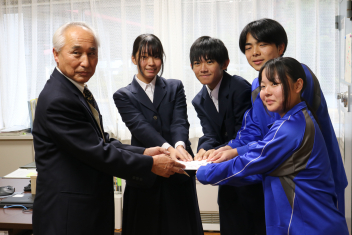 • 生徒会が大切な地域の交通手段である「ふれあいバス」存続のために、アルミ缶回収を行っています。アルミ缶を回収して得た収益を連合自治会を通して寄付しています。今日は、連合自治会長の守屋様に来校していただき、校長室で直接寄付金をお渡ししました。9月までの前期生徒会長と副会長、10月からの後期生徒会長と副会長の4名でお渡ししました。静岡新聞社の記者さんが訪れ、その様子を取材していかれました。近く、新聞に掲載されると思います。この活動も4年目となり、地道に地域に貢献を続けています。高校生や地域の皆様にもご協力いただき、本当にありがとうございます。