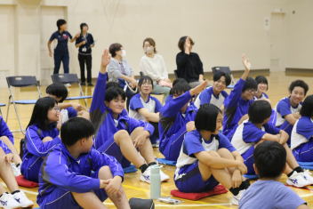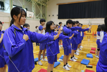• 来年9月の「休日部活動の地域展開」に向け、試行期間の1年です。先週は、ソフトテニス、弓道の2種目をクラブで実施しました。所属部の部員と顧問に地域の指導者が加わり、申し込みがあった一般参加者も入って活動しました。(所属部とは違う種目に中学3年生と卒業生の社会人OGが参加しました。)テニスはあいにくの雨模様のため、体育館で実施。2時間しっかり指導してもらいました。弓道は、平日夜間の練習会で同じ顔触れで練習していることもあり、顔なじみの指導陣の指導の下、地域の弓道場(瞑想館)で練習しました。陸上は11日(土)に初めてのクラブでの活動が行われます。