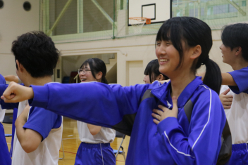 • 中高交流会の午後の部は、レクレーションと部活動体験です。レクレーションは、今年は水窪中が担当。ボッチャ大会でした。3校男女が混ざったチーム編成で競い合いました。久しぶりに100人規模の生徒が集まった体育館は熱気にあふれていました。部活動体験では、普段自分の所属する部活とは違う競技に参加。テニス、弓道、陸上、美術に分かれ、高校生の指導の下、楽しそうに活動していました。3校が一緒に行う活動は活気があって、どの活動も盛り上がっていました。