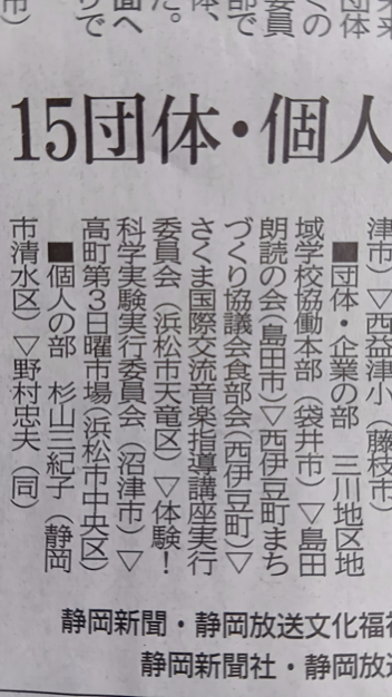 佐久間中学校から推薦した、ヤイトラーさんの長年に及ぶ音楽事業が「ふるさと貢献賞(静岡新聞社)」を受賞しました。昨年度は本校の生徒会が受賞し、これで佐久間から2年連続です。おめでとうございます。