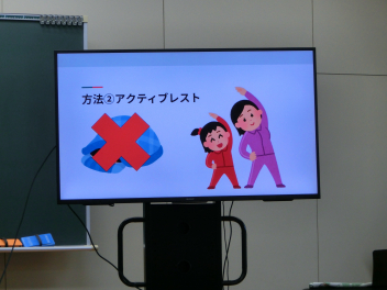 2月の月初め、「健康安全の日」でした。ここ数か月、感染症予防のため中止してきたので久しぶりの三澤先生からのお話でした。今月のテーマは「こころの健康」。がんばりすぎると割れてしまうようなガラスの心ではなく、スーパーボールのような一瞬変形しても元の形に戻って跳ね返ってくるような心をもちましょう、というお話でした。AIに作ってもらった画像が分かりやすく、イメージしやすいお話でした。そんな心を作るための「アクティブ・レスト」。私は、夜ゆっくり湯船につかって血流をよくしてから寝ますが、これもアクティブ・レストに入れてもいいですか?