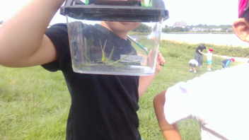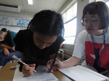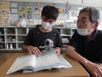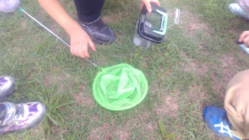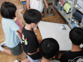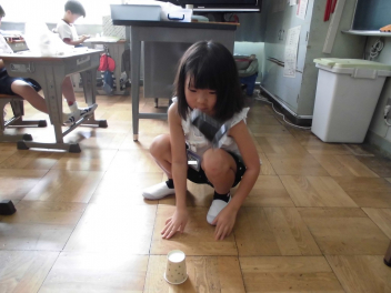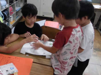 レインボー学級では、1・2年生が合同で生活科の学習を行っています。まだ暑さも残る中、思いきり砂を掘ったり水を流したりして、ダイナミックに砂場遊びをしました。「もっと掘ってみよう。」と工夫したり、他の子が掘った道を見て、「ぼくの道とつなげてみよう。」と協力し合ったりする姿が見られました。最後には、力を合わせて深く深く掘った穴に、バケツで大量の水を流し込み、次々と入って楽しみました。