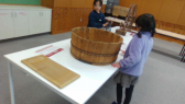 浜松市博物館から展示品をお借りして、移動博物館が開催されました。昔の人が使っていた道具を見るだけでなく、触ったり動かしたりすることができました。今の生活用品との違いに気付くこともできたようです。
