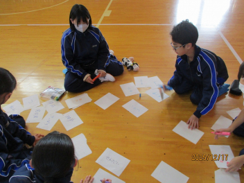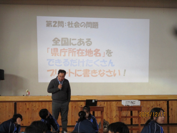 1年生の学級活動の時間に、「学年カップ」が開催されました。 今回の学年カップは、国語・社会・数学・理科・英語の5教科からクイズ形式で出題されました。生徒たちは班ごとに知恵を出し合い、一問一問に真剣に向き合っていました。正解すると、「やったー!」という大きな歓声があがっていました。