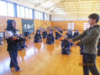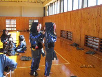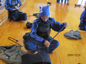 • 「防具をつける」という高いハードルも、今日で4回目。 慣れない手つきで一生懸命に面紐を結んでいました。その後の面打ち練習では、技術だけでなく「心」の意識も。打って終わりにするのではなく、相手に対して最後まで気を抜かない残心をテーマに練習に励みました。