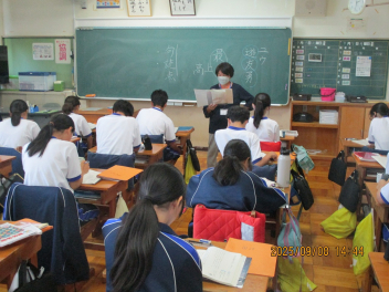 • 1年生の国語科の先生が産前休暇のため、8日から新しい先生になりました。新しい先生に緊張しながら楽しく学習を進めていました。1組の国語の板書をみて、とてもきれいな字だとつぶやく生徒が見られました。これから書写も学んでいきます。お楽しみに!