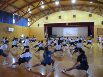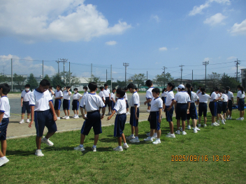 • 今日から体育大会の練習が本格的に始まりました。1年生は昼休みになると長縄をもって運動場に集合して練習していました。まだまだ回数は跳べませんが、ここから学級で話し合って課題を解決していきましょう。放課後には総練習が行われました。1,2年生はソーラン節、3年生は長縄の練習でした。ソーラン節は2年生の踊りを参考に練習していました。3年生の練習では回し手の掛け声が職員室にいても聞こえるぐらい運動場に響いていました。