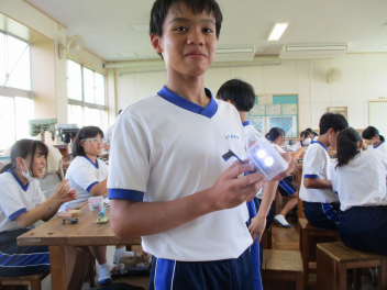 • 2年生の技術科では、防災用ライトの製作を行っています。手回し発電機を用いて、電池を使用しないでLEDを点灯させたりやブザーを鳴らせたりする製品を製作しています。電気回路に苦戦しながら試行錯誤して作っていました。回路が完成し、LEDのライトが点灯したりブザーが鳴ったりしてうれしそうでした。