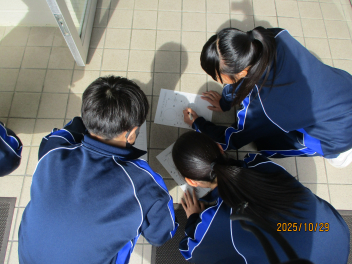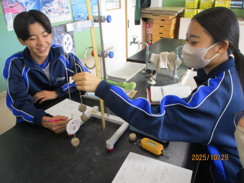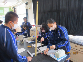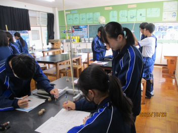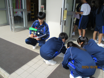 3年生は定滑車と動滑車を用いた仕事の原理を実験で見つけていました。定滑車の片方に二つのおもりをつるし、もう片方に一つのおもりだけで釣り合うようにするにはどのようにすればよいか、試行錯誤しながら見つけていました。釣り合わない班が多かったですが、粘り強く実験に取り組んでいました。「気象」と言っても、色々なものを含む言葉です。2年生は気象の学習で「天気」や「風力・風向き」、「気温」、「気圧」、「湿度」などを実験器具を用いて調査していました。器具の数値を確認しながらワークシートにまとめていました。