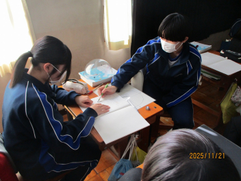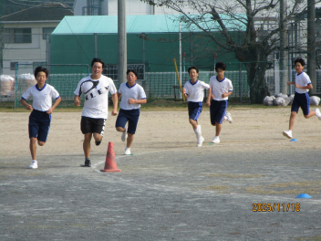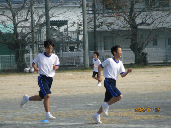 • 今日は秋晴れの中、12分間走を行っています。個人で目標設定をして1周のペースを守りながら運動場を走っていました。1週ごとにタイムを補助の生徒が声掛けしてくれるので、走っている生徒は自分のペースを確認しながら走ることができました。また、先生も一緒に走りることで生徒の走りを支えていました。