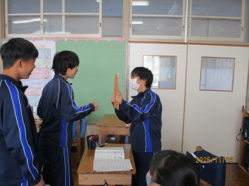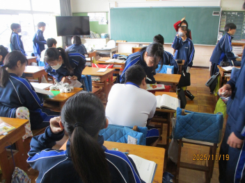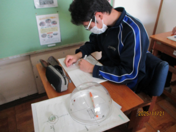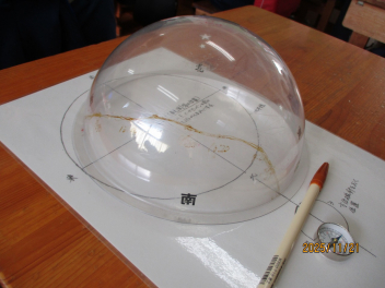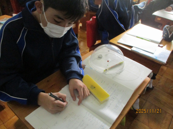 • 3年生は先週、1日の太陽の動きを実験器具で調査していました。今日はその結果をもとに、日の入りの時間を予想していました。時間ごとの太陽の動きから求めていました。友達と協力して考えたり個人でじっくり考えたりしながら時間を求めていました。