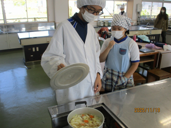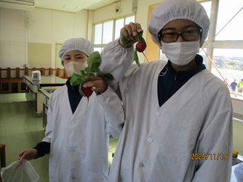 • 生活単元で栽培した大根を使って「ポトフ」を調理ました。収穫した大根は輪切りにし、他にも玉ねぎやニンジンも切り方をかえながら調子よく調理していました。気候も寒くなって体もあたたかくなりとてもやさしい味でした。