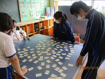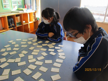 百人一首に取り組みました。 最初は読み上げられる句をじっと聞き、静かに下の句を探していました。しかし、試合が進むにつれ「一枚でも多く、早く取りたい!」という思いが、いつの間にか前のめりの姿勢に変わっていました。最後には、少しでも早く札に手を伸ばそうと自然に立ち上がり、全力で挑む姿が見られました。
