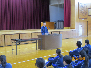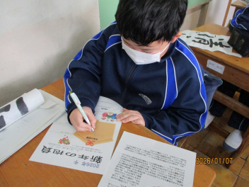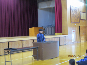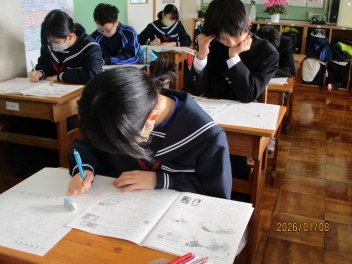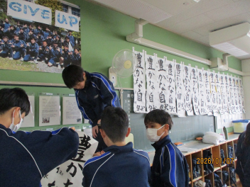 • 始業式の後、各教室では学級活動が行われました。 冬休みの宿題でもあった「書き初め」を掲示することで、新春らしい引き締まった雰囲気になりました。さらに生徒たちは、「新年の抱負」をシートに書き込んで、気持ちを新たにしている様子でした。 休み時間では、久しぶりに再会した友人たちと、冬休みの思い出を話すにこやか様子が多く見られました。
