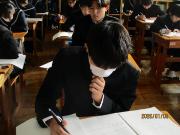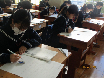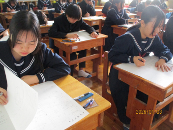 本日、1・2年生は「学力調査」、3年生は「実力テスト」を実施しました。1年生にとっては、入学後初めての学力調査です。1年間の学習内容を網羅した広い出題範囲に、戸惑いもあったかもしれませんが、最後まで集中して問題に向き合っていました。また、3年生はこれまでの学習の成果を試す大切な機会となりました。入試本番を意識したピンと張り詰めた空気の中、一人ひとりが今の実力を出し切ろうと真剣に臨んでいました。