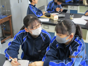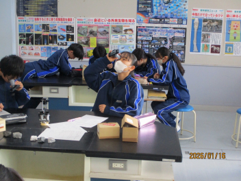 • 1年生の理科の授業では、岩石のプレパラート観察を行いました。 岩石を薄く削った「薄片」を顕微鏡で覗くと、岩石の種類によって異なる結晶が。光を通すことでまるで万華鏡のようにキラキラと輝き、生徒たちからも感嘆の声が上がっていました。私たちの身近な天竜川や阿多古川には、一体どのような種類の石があるのでしょうか。学校で学んだ知識を手に、足元の河原を調べてみると、新しい発見があるかもしれません。