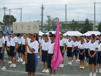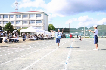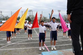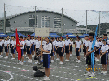 • 体育大会『合繋(ガッツ)~みんなで盛り上げて勝利をつかみとれ!~』のスローガンのもと、開催されました。開会式では実行委員長の坪井さんからすべての競技、演技を「大きな声」「キビキビとした動き」をモットーに、全力で取り組み、清竜中学校の元気を見せつけましょうとあいさつがありました。選手宣誓では本年度男子ソフトテニス部で全国大会に出場した外山さん、伊藤さんが立派に宣誓し、体育大会が始まりました。