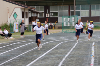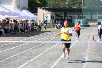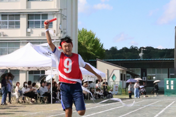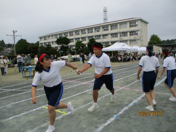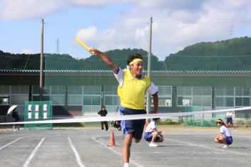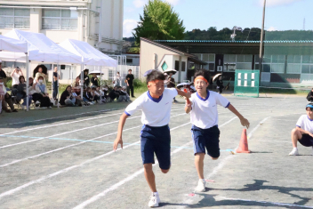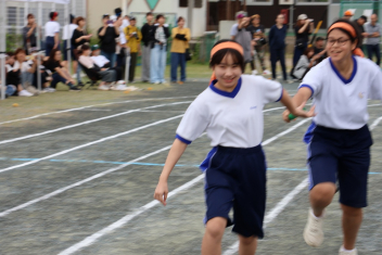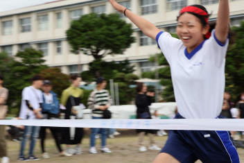 学級対抗リレーの様子です。男女別で行われました。一人ひとりの懸命な走りで次の走者にバトンを渡していました。歯を食いしばって走る姿。そして最後のアンカーは、皆の想いを力強く運んで。ゴールテープを切っていました。順位に関係なくチーム全員が抱き合い、健闘をたたえ合っていました。