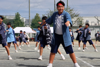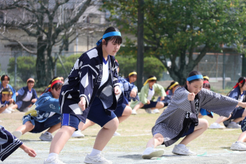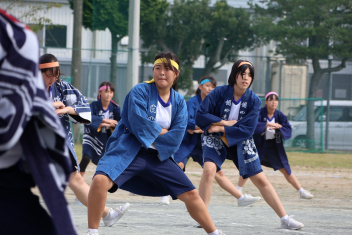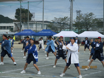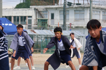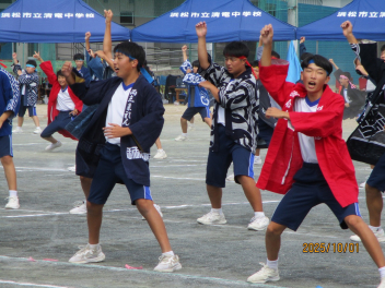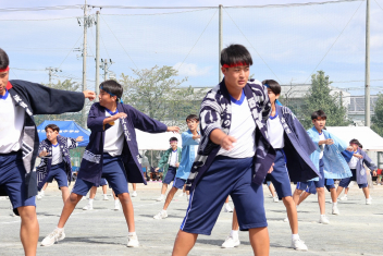 • 午後の部のソーラン節の様子です。太鼓の合図をもとに全員集合し、リーダー生徒のあいさつで始まりました。3年生男子生徒の掛け声にあわせて、全校生徒が一生懸命踊っていました。3年生は、迫力もさることながら、本当に楽しそうに踊っており、2年、1年を背中で引っ張っていました。