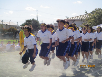 • 学級対抗みんなで大ジャンプの様子です。昼休みや放課後に練習を重ねてきて、今日の本番を迎えました。どの学級も声をそろえて1回でも多く跳べるよう最後まであきらめない姿が見られました。1年は2組、2年は1組、3年は1組が勝利しました。3年生は50回を超えていました。3年間の積み上げを感じました。