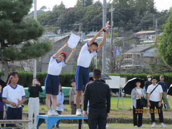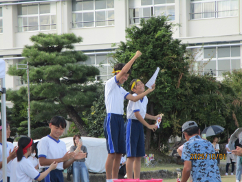 清竜中学校すべて生徒が、力を合わせ、正々堂々と競技に臨む姿は、本当に素晴らしかったです。皆さんの頑張りが、今年の体育大会を最高の思い出にしてくれました。優勝は3年2組、2年1組、1年2組でした。また、惜しくも優勝を逃した生徒も、本当にお疲れさまでした。最後まで粘り強く戦う姿は、見ている私たちの胸を熱くしました。皆さんの健闘に大きな拍手を送ります。また、陰で支えてくれた体育大会実行委員も1学期からの準備・運営、本当にありがとうございました。