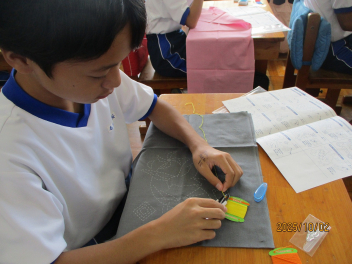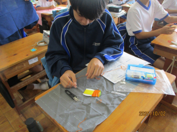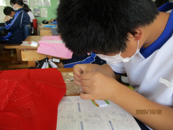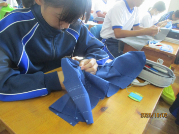 • 1年家庭科ではファイルカバーの製作に取り組んでいます。ファイルカバーの柄をさまざまな縫い方で表していきます。小学校でも学習しているなみ縫いでしるしに沿って縫っていました。針に糸を通すのに悪戦苦闘している生徒もいればどんどん作業を進められる生徒もいました。家庭でも活かせるので自分のペースで作業を進めていきましょう。