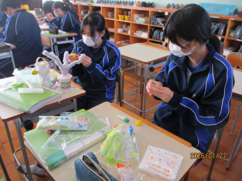 • 1年、3年どちらも「立体」にまつわる活動をしていました。1年生の教室では、数学の「表面積」の学習です。 「ここはこう解くんだよ」と友だち同士でアドバイスし合う温かい光景が見られ、一人ひとりが自分のペースで問題を解いていました。3年生は打って変わって、紙粘土を使った立体造形です。真っ白な粘土から、自由な発想で次々と形になっていきいきと活動していました。